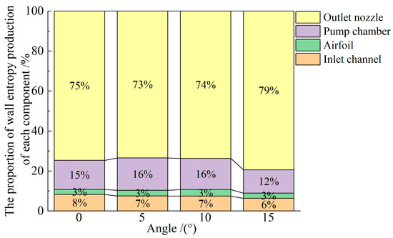 Figure 9 illustrates the proportion of wall entropy production in the total wall entropy production of different components. It can be observed that the wall entropy production is predominantly concentrated in the outlet bend component. This is attributed to the presence of a converging section and a curved section in this component, where the fluid, after passing the airfoil baffle, enters this part, leading to an increased velocity gradient. The proportion of wall entropy production for the airfoil baffle remains unchanged.
