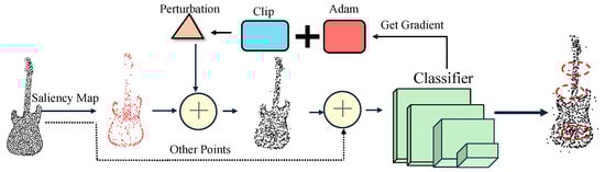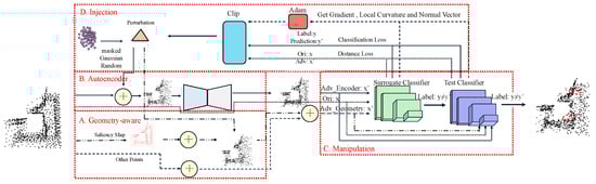 - Point cloud sensitivity maps are used to implement adaptive geometry-aware attacks. We introduce tangents, curvature, and integrated gradients (IGs) [32,33] to evaluate each point’s feature confidence in the classification results. We adaptively select the optimal attack direction and step size in the orthogonal search subspace. To address the problem of disturbance dimension explosion, global reconstruction and local interference are integrated.