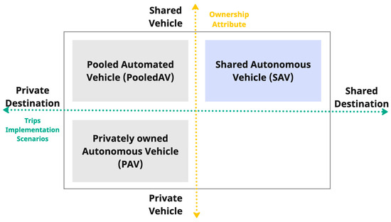 AV is classified into two categories: the vehicle’s ownership attributes (private or shared) and the implementation scenarios (private destination or uniform journey) [10].