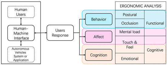 Since this study aims to compare user acceptance between different HMIs, six parameters require a relative instead of an absolute criterion. In addition, the test procedure needs to determine the specific method for evaluating these six parameters. As Van der Laan et al. (1997) stated, user acceptance is directed more toward assessing the system’s ergonomics [47]. According to Crilly et al. (2004), the consumer’s post-use reaction to HMI can be divided into three categories: behavioral response, cognitive response, and affect [48]. Their specific performance factors are also sorted out minutely in Figure 3, which shows the categories and directions of user responses in the field of ergonomics.