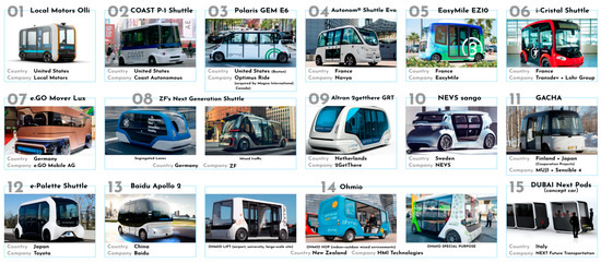 Fifteen selected examples of Autonomous Shuttle Buses (ASBs) for public transportation to deliver humans.