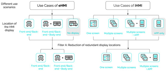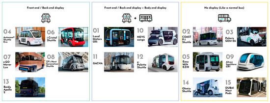 Those two approaches gather all the possible information that an HMI of an SAV can present and may appear in all the different locations and carriers. An examination of 15 prevalent concept ASBs (refer to Figure 5) was carried out via content analysis of a diverse range of media, showcasing the interactive display capabilities of the HMI.