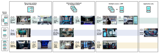 The absence of a driver will increase the demand for reliable and easily accessible information, which gives the passenger access to non-driving-related activities (NDRA). As shown in Figure 7, the interior HMIs from the 15 selected ASBs are analyzed in terms of the different interior layouts and display carriers. Displays and physical controls dominate the ASB for the internal HMI, with an application on the user’s mobile device serving as a secondary means. ASBs have essentially fixed routes and locations, and an app is used to obtain information about scheduled stops in the case of on-demand routes. It is important to exclude cases where only an app serves as the interface for human–vehicle interaction. In such instances, users do not engage with the vehicle in any physical sense, and therefore, we consider this to be beyond the scope of our research. Additionally, due to the layout and seating position of the ASB, the internal display has progressively evolved from a single primary screen to multiple screens of diverse sizes and positions [8]. The seating arrangement of ASBs differs from that of conventional buses; the majority have a circular layout, and passengers face various directions during operation, necessitating multiple displays to convey information.