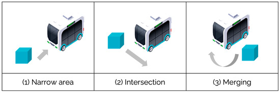 Providing sufficient travel services for residents and tourists is a complex socio-technical task for urban public transportation systems. People’s flow is at the core of future urban transportation planning and decision-making. The complexity of the situation lies in defining all the factors that interact with traffic participants. For users, the only scenario inside the vehicle is riding, while there are various scenarios outside the vehicle; hence, this approach focuses on eHMI analysis. When the driving direction of a bus does not conflict with the interactive objects outside (such as pedestrians, other AVS, motor vehicles, non-motor vehicles, etc.), the vehicle the application of AD technology on the bus does not have a substantial impact, and these scenarios do not affect users’ acceptance of this technology. As summarized by Christina et al. in 2020 [58], the following three situations contain all cases of traffic conflicts, as shown in Figure 9. Additionally, since this situation-based approach does not consider the specific background of the occurrence, such as the urban environment, highways, intersections, or parking areas, these factors will be gathered as part of the Collection of Situation-Specific Factors in Section 3.2.6.