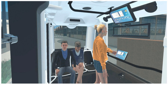 With the advent of innovative vehicular technologies, the application of autonomous driving (AD) technologies in public transportation systems is increasingly widespread, and its commercialization is expected to be soon realized on a large scale [1]. AD has already been implemented in fixed areas like underground [2,3]. Shared Autonomous Vehicles (SAV) [4], especially automated shuttles, have garnered significant attention in this context. In this study, SAV refers to shared ownership of public vehicles with private destinations (see Figure 1), commonly known as robot taxis or automated shuttle buses (ASB) [5]. This type of vehicle demonstrates the capability to autonomously navigate through most driving scenarios without the presence of a service attendant onboard, achieving a Level 4 autonomy rating on a scale ranging from 0 to 5 [6]. Distinct levels of autonomy correspond to varying degrees of human intervention, with levels 1–3 necessitating a human driver, whereas levels 4 and 5 facilitate driverless vehicle operation [7]. Contemporary vehicles are equipped with various advanced technologies, including optical radar, cameras, touch panels, GPS sensors, and algorithms that analyze the driver’s steering behavior. Future vehicles are expected to expand the scope of potential interactions, shifting gradually from driving as the central task to prioritizing leisure and entertainment [8]. The communication interfaces between users and AVs will become more prominent in this evolving landscape. Consequently, examining the transformations in HMIs is crucial [9].