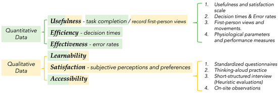 The assessments can be achieved by defining the factors that need to be measured. Using the above scale, participants’ interactive behavior could be recorded. Once the specific measurement indicators for different user acceptance factors are defined, it is convenient to collect the embodied data by analyzing user interaction behavior and HMIs. Jeffries et al. (1991) examined four methodologies for assessing user interfaces: heuristic evaluation, software guidelines, cognitive walkthroughs, and usability testing [53]. These four methods have room for application in this test protocol. As data collection methods are shown in Table 4, investigation techniques can be classified by the timeline based on qualitative and quantitative ways.