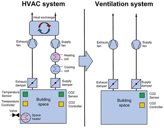 Component overview for typical HVAC system (left) and the considered ventilation system (right).
