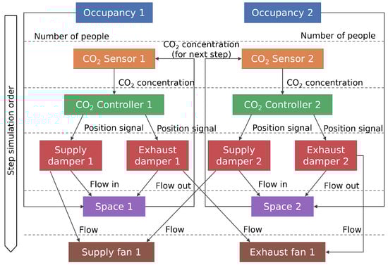 Components connections, and step simulation order for a model with one ventilation system servicing two building spaces.
