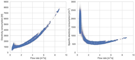 Relations between measured flow rate and power consumption (left), and flow rate and specific power consumption (right) for the supply fan in “ventilation system 1”. The measurements span all of 2022 with a 1 min resolution (525,600 data points) so a low opacity is used for each point in the graphs.