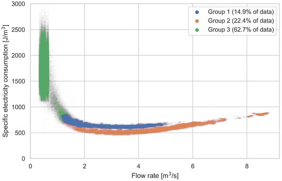 Flow vs. specific power consumption for the supply fan in “ventilation system 1”. The data points are separated in three color groups according to graph coordinates. Color groups 1 and 2 indicate two clearly separated “belts” following slightly different flow rate and specific power correlations. Color group 3 contains the rest of the data points.