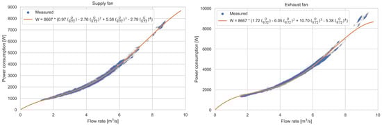 Selected data points of measured flow rate against measured power consumption alongside fitted fan power function for the supply fan in “ventilation system 1” (left) and the exhaust fan in “ventilation system 1” (right).