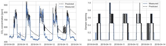 Simulated and measured values for CO2 concentration (left) and ventilation damper position (right) in the building space “Ø22-511-2” (139 m2 teaching room) during a workweek in 2018.