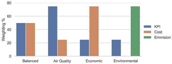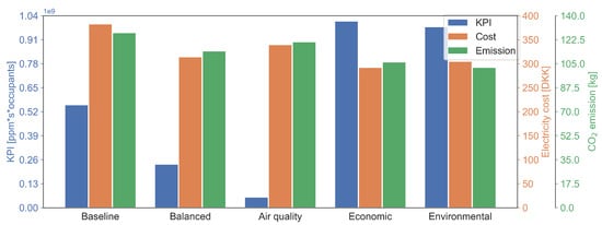 Five scenarios are explored for the operation of ventilation in the teaching and office building: one with the rule-based control (“Baseline”) and four using MPC with different objective weights (“Balanced”, “Air quality”, “Economic” and “Environmental”). Relative weighting in the scenarios is illustrated by Figure 7. The different MPC strategies in the scenarios are designed to represent different objective priorities: