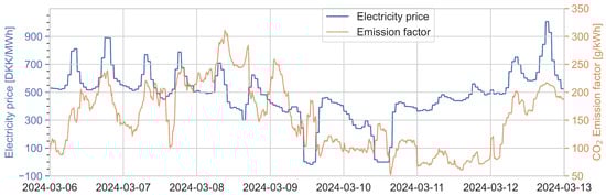 Electricity prices and CO2 emission factors for the one-week simulation period used in MPC simulation.