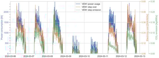 At equal weighting the KPI-cost relation is: 1000 ppm·h·person = 0.81 DKK, i.e., raising the CO2 concentration by 1000 ppm above the threshold in one hour for one person produces the same penalty as increasing the electricity cost by 0.81 DKK. The emission–cost relation at equal weighting is 4.49 = 1 DKK, since the average electricity price (January–June 2024) in DKK is 4.49 times the average CO2 emission in kg. The electricity prices and CO2 emission factors for the simulated period are shown in Figure 8.