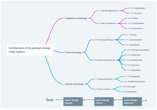 The second aspect, Care Technology, focuses on improving human–machine and interpersonal interactions by incorporating innovative and humanistic thinking. This aspect includes the criteria of “Personalized Design” and “Function Enhancement”, which are supported by indicators such as privacy, customization, intelligence, energy consumption, extension, interactivity, accuracy, and reliability. These indicators address the functionality and adaptability of wearable devices in various usage scenarios.