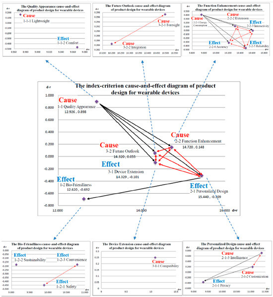 This study developed the DANP expert questionnaire based on the results of the fuzzy Delphi analysis to explore the cause-and-effect relationship and correlation between the product design indicators of wearable devices. First, based on the total impact relationship matrix of criteria and indicators, we calculated the column sum and row sum of the total impact relationship matrix T. This study used d + r (correlation degree) as the abscissa and d − r (cause degree) as the ordinate to form a cause-and-effect diagram, in which the criteria and indicators of product design for wearable devices were plotted. In addition, the total impact relationship matrix was simplified based on the criteria and indicators, and then the correlation between the criteria or indicators was depicted in the cause-and-effect diagram to explore whether the impact relationship between the criteria or indicators was one-way (black index line) or two-way (red index line).