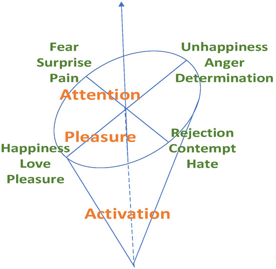 Mehrabian [25] proposed the Pleasure–Arousal–Dominance (PAD) model, which is one of the most recognized models. He believes that the emotional process is composed of three dimensions: pleasure (happiness), arousal (activation), and dominance (attention); the spatial expression is shown in Figure 1. The theory holds that any emotional state can be found in the inverted cone space. Another representative dimensional emotion model is the two-dimensional Valence–Arousal model proposed by Russell [26], who believes that “pleasure” and “arousal” can describe the vast majority of complex emotions.