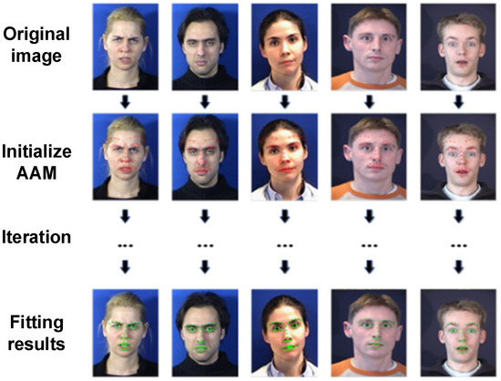 where is the texture feature vector of the test image, and is the texture feature vector of the current AAM. The variance energy function can be defined and used to evaluate the matching degree of the AAM. In the process of locating and matching emotion description points according to the linear expression of the model, the model parameter group is updated iteratively through an effective matching algorithm (the gradient descent method was used in this study) to minimize E. The process of fitting the image with the AAM and locating the emotional description points is shown in Figure 4. The location information of the facial emotion description points of the test data were obtained.