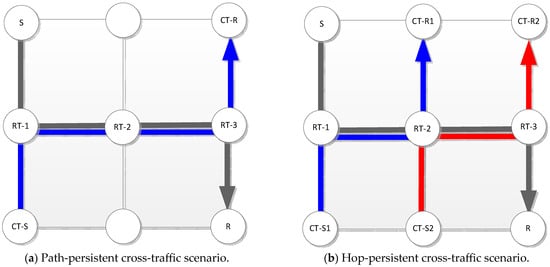 Some representative testbed scenarios from related literature for evaluating network estimation tools. The black arrow represents the measurement data, while the blue and red arrows indicate independent cross-traffic flows. Abbreviations: S, sender; R, receiver; RT, router; CT-S, cross-traffic sender; CT-R, cross-traffic receiver; AP, access point; IN, intermediate node.