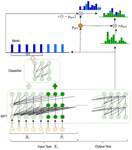 However, in environments where LLMs cannot be used, sLLMs (small LLMs) in the form of GPT often struggle to achieve desired results with zero-shot learning alone []. We aim to introduce a copying mechanism to GPT, which is a method that preserves keywords found in the input while having limited training data. As far as we know, encoder–decoder transformer models like T5 [] have achieved excellent results in applications requiring specific contexts by using a copying mechanism, but there have been no instances of its application in GPT.