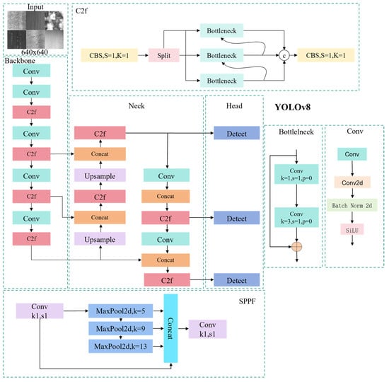 YOLOv8 is a significant upgrade of the YOLO series of real-time object detectors launched by Ultralytics, aimed at enhancing the accuracy and efficiency of object detection. Its structure, as shown in Figure 1, features numerous innovations in architectural design. YOLOv8 employs a C2f backbone, which improves the model’s ability to recognize targets in complex environments. Additionally, to enhance detection performance, the decoupled head design allows for the independent processing of object classification and localization. The model also introduces an anchor-free approach, reducing reliance on manual anchor box configuration and ensuring robust generalization capabilities. This version offers five different model options—n, s, m, l, and x. Each model varies in parameter count, computational complexity, and performance, catering to the requirements of different hardware environments and application scenarios. These improvements have enabled YOLOv8 to achieve outstanding results across multiple standard datasets, further advancing the progress of real-time object detection technology.