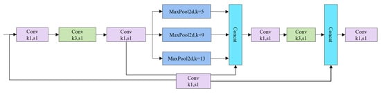 The multi-stage spatial pyramid pooling cross-stage partial concatenation (SPPCSPC) module, shown in Figure 3, combines the advantages of the SPP and CSPC modules. The SPP module enhances the detection of different defect scales by capturing more scales of features from the image through multi-scale pooling. The CSPC module introduces cross-stage partial concatenation, which improves the feature utilization efficiency and the gradient flow, and efficiently alleviates the gradient vanishing problem. By combining multi-scale feature extraction with efficient feature linking, the SPPCSPC module can better realize image classification and object detection and ultimately improve the overall performance.