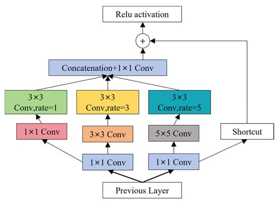 The receptive field block (RFB) module enhances traditional convolution operations through a series of convolution, normalization, and activation functions. As shown in Figure 5, the RFB module expands the receptive field, enabling the network to capture more comprehensive semantic information. Compared with traditional convolution operations, the RFB module significantly improves the perceptual capabilities of the network without increasing the number of parameters and computational costs. This improvement enables the model to better adapt to target objects of different sizes and shapes, thereby improving its performance in defect detection tasks.