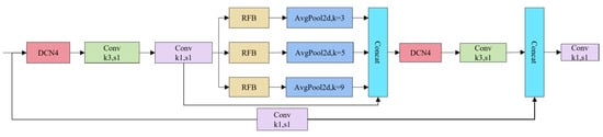 To improve attention to the densely packed small target samples, the proposed SCRD structure employs the SPPCSPC module as its core component. To improve the SPPCSPC module to extract multi-scale features, previous studies have shown that modifications to the SPPCSPC module can significantly enhance detection accuracy in multi-scale object recognition tasks. For example, Zhao et al. [] improved classification accuracy through SPPCSPC. Similarly, Wan et al. [] replaced the SPPF module with an improved SPPCSPC to enhance feature representation capability and efficiently implement multi-scale feature fusion. Initially, dilated convolution and parallel convolution are integrated through the RFB module to enhance the model’s feature extraction capabilities. Traditional max pooling, which selects only the maximum value as output, often overlooks detailed and local features, particularly in small target detection where such details are crucial. In contrast, average pooling retains more local detail information and is less sensitive to noise, making it more suitable for detecting small targets. Therefore, max pooling is replaced with average pooling, and the pooling kernel sizes are adjusted to 3, 5, and 9 to better preserve the local details of small objects. Additionally, variability convolution via DCNv4 is introduced in place of standard convolution layers, allowing for more flexible adaptation to target shapes and sizes and further enhancing feature extraction. The SCRD structure is illustrated in Figure 6.