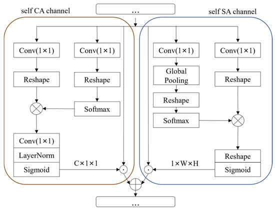 Similarly, in the spatial attention module, 1 × 1 convolution is used to transform features into Q and V. For Q, global pooling is used to compress the spatial dimension, and then, the Softmax operator is used to enhance Q, and V remains unchanged. The spatial branch computes the weight Asp(X) as follows, and σ3 is the tensor reshape operator. FSG represents the nonlinear activation function, σ1, σ2, and σ3 are activation functions for processing linear transformations, FGP denotes the global pooling operation, and Wq(X) and Wv(X) are linear transformation matrices:
