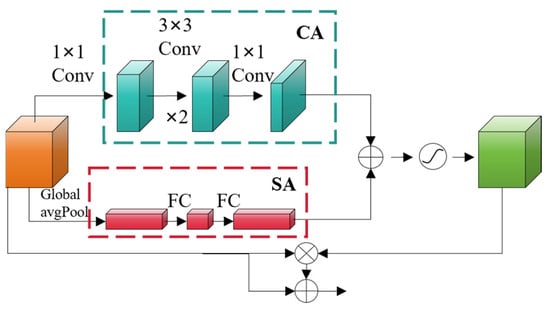 The structure of the BAM is shown in Figure 8. For the input feature map F, the channel dimension features are generated by using global average pooling in the channel attention module (CA), and then the input channel weights are learned through two fully connected layers FC, and finally, the C × 1 × 1 channel attention weights Mc(F) are obtained.
