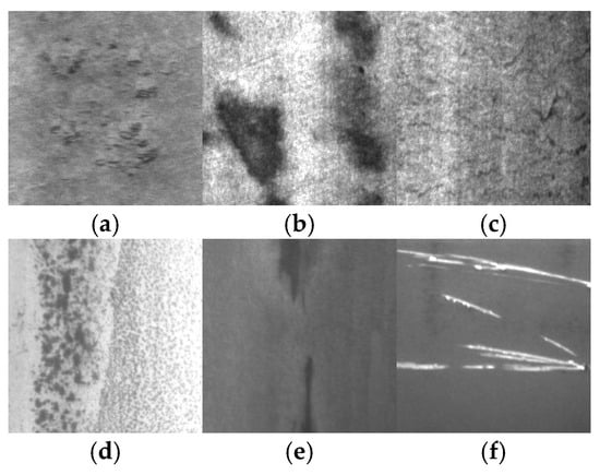 Strip surface defect categories in the NEU-DET dataset: (a) oxide skin; (b) patches; (c) cracks; (d) pitted surface; (e) inclusion; (f) scratches.