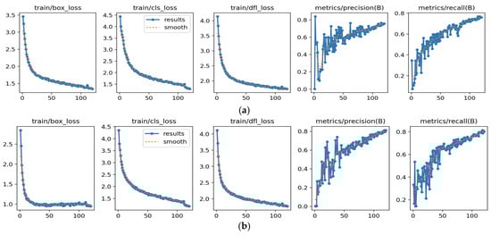 YOLOv8n-BSPB loss function curve: (a) YOLOv8; (b) YOLOv8-BSPB.
