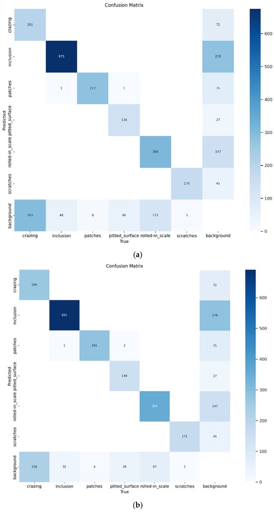 Confusion matrix for the validation set with defects of different classes: (a) confusion matrix of YOLOv8n; (b) confusion matrix of YOLOv8n-BSPB.