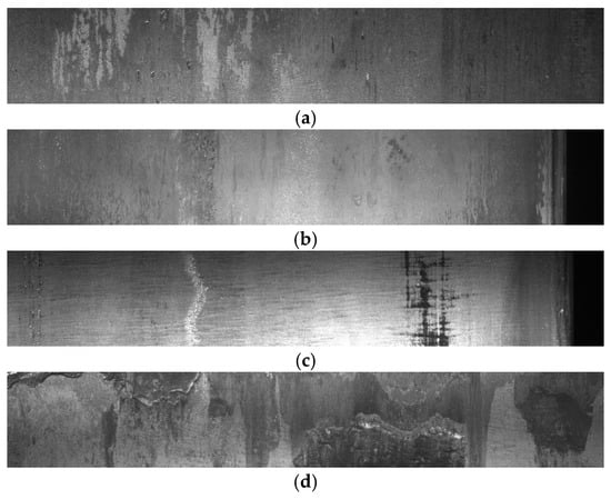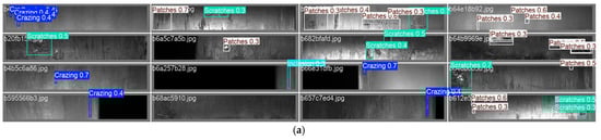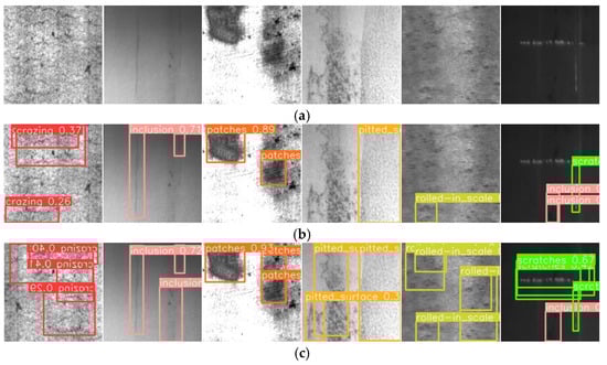 To validate the effectiveness of the model, the experimental environment was kept consistent, with the dataset randomly split into a training set and a validation set in a 7:3 ratio. The model was trained for 120 epochs, with an image resolution of 640 × 640 pixels, a batch size of 16, and an initial learning rate (lr0) of 0.01. The model was tested using both the Kaggle steel strip dataset and defect data collected from an actual factory. The Kaggle dataset contains four types of defects, as shown in Figure 16. The dataset includes a total of 6666 defect images, with 4666 images in the test set and 2000 images in the validation set.