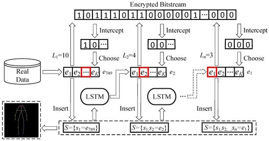 - Restoring the encrypted bitstream: Acquire the initial element candidate set Set1 and establish a mapping relationship between the elements in this set and the binary encoding. Obtain the initial element s1 from the sequence S and obtain the corresponding binary encoding based on the mapping relationship. Insert this encoding into the encrypted bitstream M′. Suppose the sequence S has n elements. For each subsequent element starting from the second one, perform the following: Sequentially input the first i − 1 elements in S into the sequence generation model to obtain the probability distribution Pr(si|s1, s2, …, si−1). Sort these indexes in descending order of their probabilities and eliminate those indexes that are lower than the threshold τ to initially form the candidate set Seti. Subsequently, select the top K = 2Li indexes with the highest probabilities as the final candidate set Seti and establish the mapping relationship between it and the binary encoding. Obtain the element s1 from the sequence S, obtain the corresponding binary encoding based on the mapping relationship, and insert this encoding into M′.Repeating Steps 1 and 2 to extract the bitstreams embedded in multiple stego-images, thereby obtaining the complete encrypted bitstream M′.