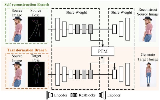 To resolve the significant geometric deformations that occur during pose transformation, Zhang et al. [] introduced the dual task correlation and affinity learning mechanism (DPTN-TA) to transform the human image from source to target pose. Central to this approach is incorporating an auxiliary task—specifically, a source-to-source (self-reconstruction) task—supported by a twin-network architecture that enhances the learning process for the source-to-target (transformation) task. This design enables the model to effectively leverage color, texture, and shape information from the source image while preserving details in the target image and stabilizing network training. Furthermore, this method integrates a texture affinity loss function to supervise texture mapping better and ensure that synthesized images retain more details from their original appearance.