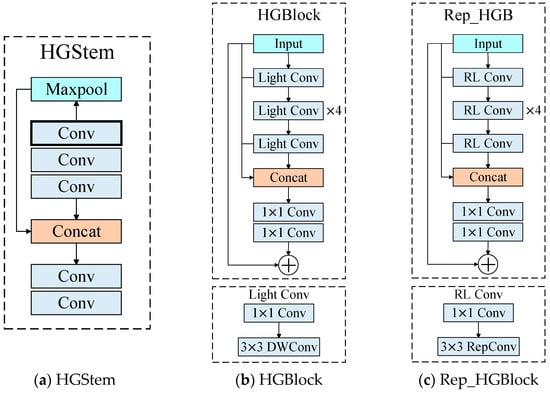 The HGStem module is primarily constituted by convolutional layers and is accountable for extracting target features at the input stage of the network. Its structure is depicted in Figure 6a. Such a design guarantees that the backbone network can capture abundant feature information with a relatively small number of parameters and computational efforts. The HGBlock module initially employs a lightweight convolutional block (Light Conv) for feature extraction, then utilizes a convolutional block (Conv) with a kernel size of 1 × 1 to adjust the number of channels and finally conducts feature fusion with the residual connection of the adjusted features. Its structure is presented in Figure 6b. This module adopts a hierarchical processing mechanism; namely, each HGBlock processes different levels of data, and each level concentrates on capturing features within a specific range, realizing the hierarchical processing of information. Apart from the HGStem module and the HGBlock module, the Depthwise separable convolutional block (DWConv) is also directly integrated into the backbone network. Compared with Conv, DWConv demonstrates a significant reduction in both the number of parameters and computational cost.