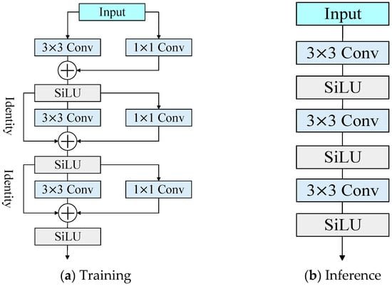 Rep_HGBlock was enhanced from the HGBlock to achieve a more lightweight design and reduced computational complexity. Its architecture is illustrated in Figure 6c, where RepConv replaces DWConv in Light Conv. The RepConv module was initially introduced in the VGG [] network. By incorporating an identity residual branch, the training and inference phases of the model are decoupled. In this study, enhancements were made to RepConv by substituting the original ReLU activation function with SiLU to better facilitate deep layer processing within the model. Figure 7 presents the RepConv module’s structure during the training and inference phases. The training phase (Figure 7a) comprises a 3 × 3 convolution, a 1 × 1 convolution branch, and an identity residual structure, resulting in a multibranch network architecture. The introduction of residual connections in RepConv effectively addresses gradient vanishing issues while accelerating the convergence speed of the network. During inference (Figure 7b), stacked 3 × 3 convolutions along with SiLU significantly enhance inference speed.