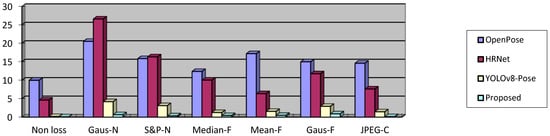 This section carried out multiple sub-experiments on the above-mentioned different image attack methods. Firstly, the average information extraction bit error rate of the proposed method under different pose estimation networks [,,] was compared. The results are shown in Figure 10. Among them, the parameters of Gaussian noise, salt and pepper noise, median filtering, mean filtering, Gaussian filtering, and JPEG compression are 0.001, 0.001, 3 × 3, 3 × 3, 3 × 3, and Quality-90, respectively. Subsequently, the average information extraction bit error rates of each method were compared, and the results are presented in Table 4. The experimental results demonstrate that since the proposed method relies on the pose estimation network optimized for steganography applications in the effect of extracting secret information, its robustness effect is more significant compared to some common steganography methods.