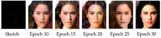 The PGPIG model utilized in this study imposes stringent requirements on the training dataset, significantly limiting its applicability. Specifically, the dataset must be divided into groups, each containing images of the same object displaying multiple poses with consistent scales and simple backgrounds to learn target pose generation effectively. This study employed the Pix2Pix model as an alternative to address these limitations. Pix2Pix [], a CGAN-based image to image translation model, integrates conditional information within the generator and discriminator framework. Combined with the U-Net architecture, it enables the generation of images tailored to specific input conditions, making it particularly suitable for structured image transformations, such as converting sketches into photorealistic representations.