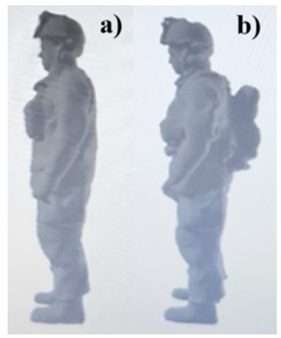 A side view gray-scale avatar from the Size Stream SS20 body scanner of a male firefighter participant wearing (a) a turnout suit and (b) a turnout suit with a provided self-contained breathing apparatus (SCBA).