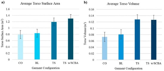 One-way ANOVAs found significant differences (p < 0.05) between garment configurations for both torso surface area and volume. Differences in torso surface area and volume were statistically significant for all garment configuration pairwise comparisons except for the CO when compared to BL and the TS when compared to the TS w/SCBA.
