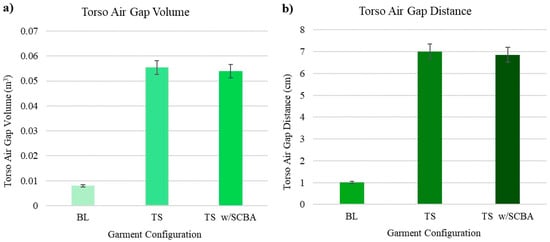 The (a) average torso air gap volume and (b) average torso air gap distance of the measured participants for the base layer (BL), turnout suit (TS), and turnout suit with SCBA (TS w/SCBA) garment configurations. Error bars represent percentage error.