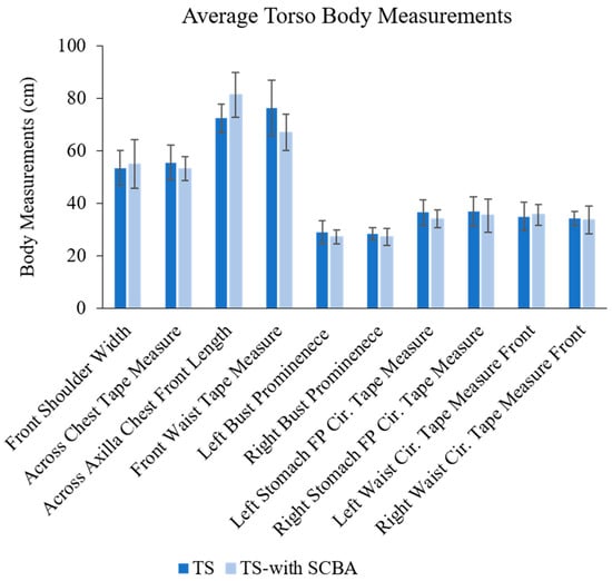 The average front torso measurements of all nine participants when wearing the turnout suit with (TS w/SCBA) and without the SCBA (TS). Error bars indicate standard deviation.