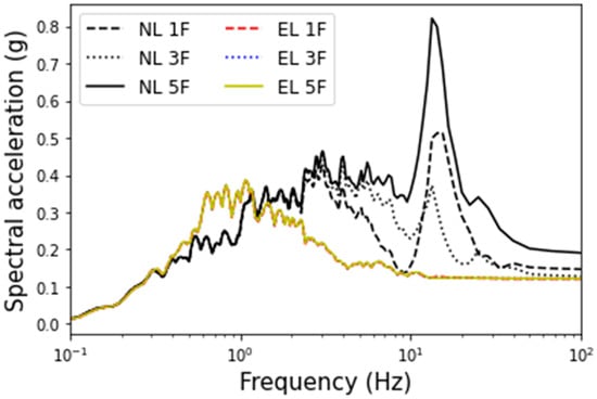 Because isolated structures normally behave nonlinearly due to the bilinear type of hysteresis behavior of isolators, nonlinear analysis needs to be performed to analyze the dynamic response. However, due to the complexity of the nonlinear model and the computing resource required for nonlinear analysis, elastic analysis is sometimes performed by replacing it with an equivalent linear isolator model. The accuracy of linear analysis using the equivalent linear model has been confirmed through many studies [25,26,27,28,29,30], and equivalent linear models are more efficient in calculating the member forces of the structure because the equivalent models predict the maximum force of nonlinear models comparably accurately [30]. In terms of the ISRS, as can be seen in Figure 2, when a linear analysis is performed using an equivalent linear model, the peak of the ISRS occurs only at the isolation frequency. In addition, because the entire structure behaves as a rigid body in the elastic region, all floors show almost the same response. However, in the case of nonlinear model, as the isolators began to behave nonlinearly beyond the yield point, an additional peak occurred at frequencies other than the isolation frequency, and it can be seen that all floors show different responses. The equivalent linear analysis is more efficient for calculating the structural force response, but when evaluating the floor acceleration response, it may not be suitable for evaluating the ISRS because the response at all floors is the same and the peak occurs only at the isolation frequency. Therefore, in this study, a nonlinear analysis was performed to analyze the ISRS variability according to variables that may affect the hysteresis behavior.