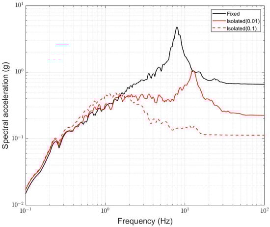 Many factors, such as the mechanical properties of the structure, site amplification, and ground motions, affect the nonlinear behavior of isolated structures, but the factor that has the highest priority is the mechanical characteristics of the isolator. The application of isolators began in the 1970s, and the criteria for displacement and mechanical characteristics of isolators have been established through various analytical and experimental studies [16,17]. The secondary stiffness and the characteristic strength, which contributed significantly to nonlinear behavior, can be easily derived from the material properties of isolators, so values were suggested for use according to the design purpose. However, because the initial stiffness is difficult to estimate, it is generally expressed as a ratio to the secondary stiffness. There were no clear criteria for this stiffness ratio, so only a recommended range of about 0.05 to 0.11 [16,17] was proposed, and different values are used in various studies and designs. In the case of lead–rubber bearings, when the weight of the superstructure is very large and a large damping effect is required, an isolator with a large sectional area for lead is used. This causes high initial stiffness and characteristic strength, but it has been confirmed that this amplifies the acceleration response [12,14]. Figure 3 shows the ISRS with the LRB applied to a five-story beam stick mass-lumped model performed in a previous study [32]. In this previous study, the mass and stiffness of the structure were adjusted so that the natural frequency was the same at 8 Hz, and the mass of the basemat was also set to 30% of the structure mass. As shown in Figure 3, when comparing the ISRS of the fixed and isolated structures with a stiffness ratio of 0.01 and 0.1, the response is completely different depending on the initial stiffness. When the initial stiffness is large (stiffness ratio is 0.01), a large amplification occurs at the frequency of the superstructure itself, and the equipment with a high frequency in the structures may be more vulnerable compared to the fixed structure. An additional point to consider here is that the dominant frequency of the structure shifts. The ISRS peak of the fixed structure occurred at 8 Hz, which is the first natural frequency of the structure, but the peak occurred at about 13 Hz in the isolated structure.