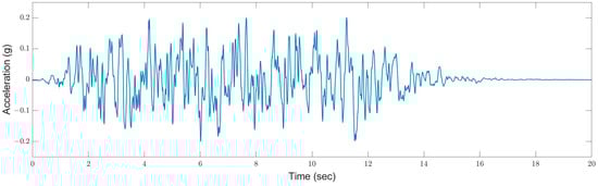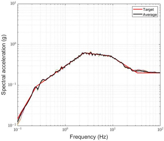 The input motions were used by generating artificial ground motions that match to the design response spectrum with a PGA of 0.2 g and a damping ratio of 5% specified in Reg. Guide 1.60 using a stochastic method [38,39]. The seismic intensity of 0.2 g was determined to be the level at which NPPs can operate normally even if an earthquake occurs (Operating Basis Earthquake, OBE). To ignore the variation that may occur due to the ground motion time history matching with the target spectrum, 10 sets were generated, and the results were averaged by these input ground motions. The response spectra of the generated ground motion time histories and the target response spectrum are depicted in Figure 8, and the time history of the input motions is depicted in Figure 9. In addition, these input motions were scaled with PGAs of 0.3 g, 0.4 g, and 0.5 g for the analysis of increased seismic intensity.