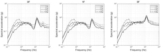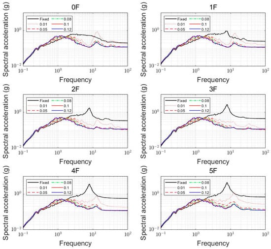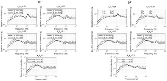 Because the maximum displacement varies depending on the seismic intensity and may affect the ISRS due to changes in the hysteresis behavior, the ISRS variability was analyzed by inputting different seismic intensities to the structure to which an isolator with a stiffness ratio of 0.01 was applied. The ISRS results analyzed by inputting motions with PGAs of 0.2 g, 0.3 g, 0.4 g and 0.5 g are shown in Figure 16. As confirmed in the previous results, large responses occurred at stories far from the middle story, the center of rotation of the structure, so only responses of 0–1F and 5F were depicted. As the seismic intensity increased, the response in the low-frequency range, including the isolation frequency increased significantly. Although the response increased with the seismic intensity in the high-frequency range, the natural frequency of the structure was not affected by the seismic intensity. As can be seen in Figure 17, as the seismic intensity increases, the hysteresis behavior increases and the isolation frequency decreases, so the response in the low-frequency range increased. And because the force required in the elastic range before yielding was the same, the response at the natural frequency of the structure appears to be the same. That is, it can be seen that the seismic intensity has a large effect in the low-frequency range where the isolation frequency is included, but at the high-frequency range where the natural frequency of the structure is included, the initial stiffness acts as a larger variable. Figure 18 is a graph showing the ISRS according to the seismic intensity for each stiffness ratio at 0F and 5F. In the low-frequency range, the same variability was observed depending on the intensity regardless of the stiffness ratio. In the high-frequency range, except for the stiffness ratio of 0.01, the response increased as the intensity increased, but the variability was less than that of the low-frequency range. In the case of the stiffness ratio of 0.01 that the initial stiffness was very large, the response at the natural frequency of the structure was similar regardless of the intensity, and it was confirmed again that the initial stiffness had a significant influence on the high-frequency range. Although the frequency with a peak in the low-frequency range tends to change and the response increases with the seismic intensity, this appears to be enveloped by the largest intensity. It is judged that even if the response in the low-frequency range is significantly affected by the intensity, it does not need to be considered when developing the design ISRS.