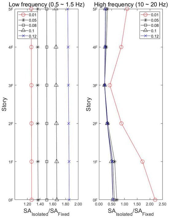 Figure 13 shows the ISRS for each story according to the initial stiffness with different stiffness ratios. As the initial stiffness changes, the ISRS response difference at the shifted structure frequency occurs the most, and it can be confirmed that it generally affects the high-frequency range. Looking at the hysteresis behavior of the isolator by the stiffness ratio in Figure 14, the smaller the stiffness ratio (larger the initial stiffness), the greater the tendency for the maximum displacement to decrease. This means that as the stiffness increases, a strong force is applied to cause the initial displacement, so the maximum displacement decreases, and the high-frequency response increases as the superstructure behaves as a rigid body with the isolator. Conversely, as the initial stiffness decreases, the effective stiffness decreases, and the response at a low frequency increases. Figure 15 shows the amplification ratio compared to the fixed response for the low-frequency range (0.5 to 1.5 Hz), where the isolation frequency changes depending on the stiffness ratio, and the high-frequency range (10~20 Hz), where the frequency of the structural mode varies. The maximum ratio of the fixed and isolated ISRS in the low and high-frequency ranges was shown for each story in Figure 15. As the initial stiffness was smaller (the stiffness ratio was larger), the ISRS of the isolated structure tended to be larger than the fixed ISRS in the low-frequency range, and in the high-frequency range, it showed a smaller response, except for the stiffness ratio of 0.01. In addition, it can be confirmed that in the low-frequency range, the maximum SA ratio was the same on all floors, whereas in the high-frequency range, the ratio was larger at 0F and 5F, which were farthest from 3F, the center of rotation. At the low-frequency range, the maximum SA ratio was the same on all floors because the first-order mode behavior of the isolated structure was dominant, and the high-frequency range appeared to be significantly affected by the high-order mode behavior. That is, in the low-frequency range, not only the response intensity but also the frequency variability exists, and the response may be larger than that of a fixed structure. Therefore, if there is much low-frequency equipment, the seismic isolation system effect may be disadvantageous. In the high-frequency range, there is no frequency variability, but the response intensity is greatly affected. In the case of high-frequency equipment, it is important to design to avoid the shifting structure frequency due to the isolation system rather than the fixed-structure frequency. Although the response is reduced due to the isolation system, the effect may be less depending on the initial stiffness. Therefore, the conservative ISRS should be developed by considering both high and low-frequency ranges for the recommended stiffness ratio range.